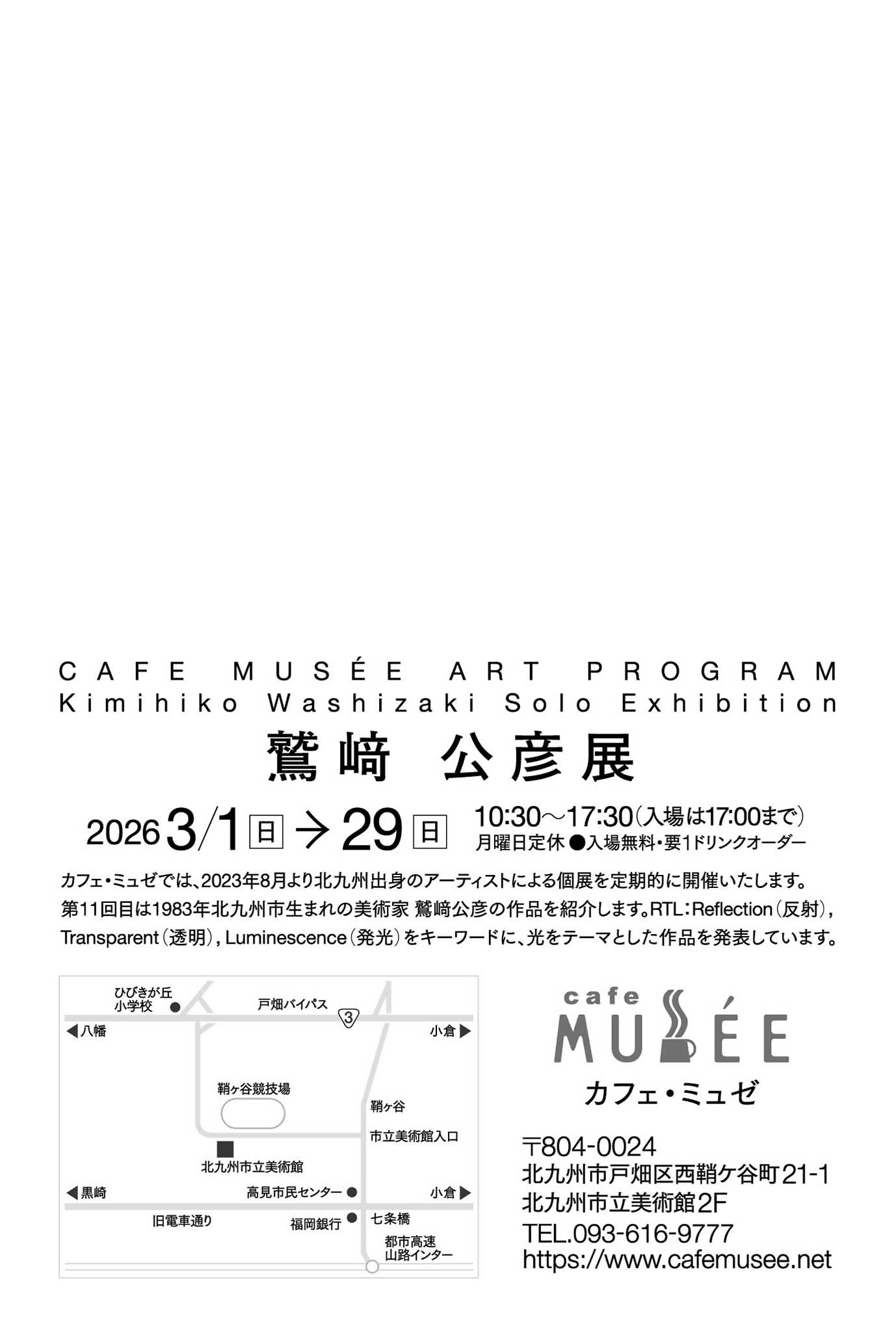 カフェ・ミュゼ ART PROGRAM「鷲﨑公彦展」 2026年1月22日(木) イベント 地元芸術家と市民とをつなぐ取組みの一環として、 本市出身アーティスト鷲﨑 公彦(わしざき きみひこ)の作品を「カフェ・ミュゼ」内に展示します。 会場 本館2階「カフェ・ミュゼ」 日時 3月1日(日)~3月29日(日) 10:30~17:30(入場は17:00まで) 観覧料 無料※ワンドリンクオーダーをお願いします 主催 株式会社 千草 前の記事 お知らせ一覧 次の記事