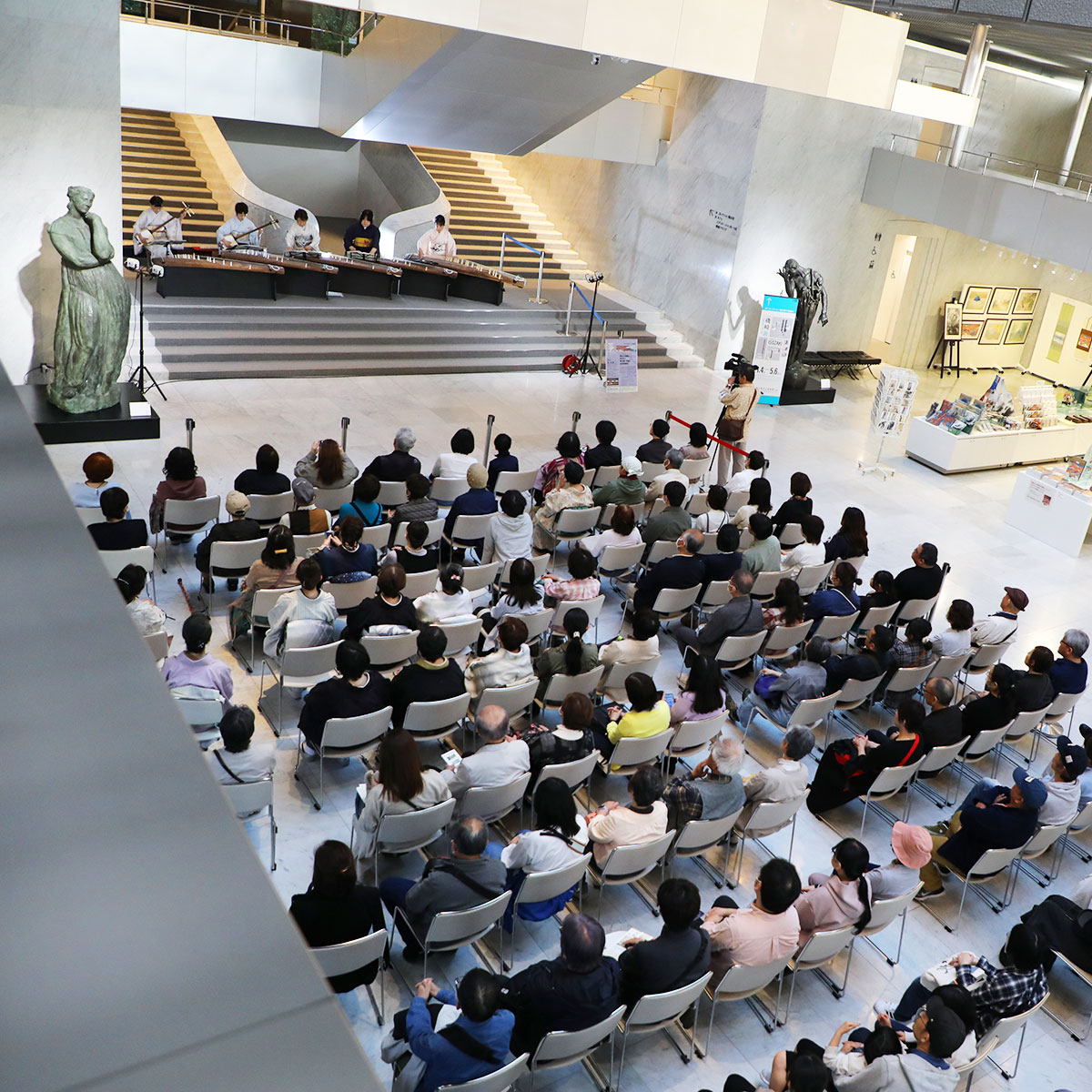 多くの方々に美術館をより身近に、さらに親しみを感じていただくため、美術館パートナーズ様のご協賛のもと、夜間特別開館し、記念演奏会として開催しました。演奏会では、和楽器や伝統音楽の普及、育成事業を推進するNPO法人和楽啓明(わがくけいめい)様の音色がエントランスホールに響き、大盛況の下執り行われました。